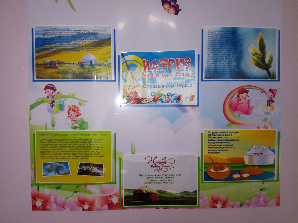16 и 19 марта были проведены праздничные утренники «Наурыз - Думан», «Наурыз келді». С целью обогащения знаний детей об истории, народном творчестве и культуре народов Казахстана. На празднике дети продемонстрировали свои таланты: пели песни, танцевали, играли в игры, читали стихи. На утреннике был проведен казахский обряд «Тұсау кесу» («Обрезание пут»). Обряд сопровождается песнями и пожеланиями того, чтобы ребенок твердо стоял на ногах, уверенно шел по жизни. Все получили большое удовольствие оттого, что увидели в зале.